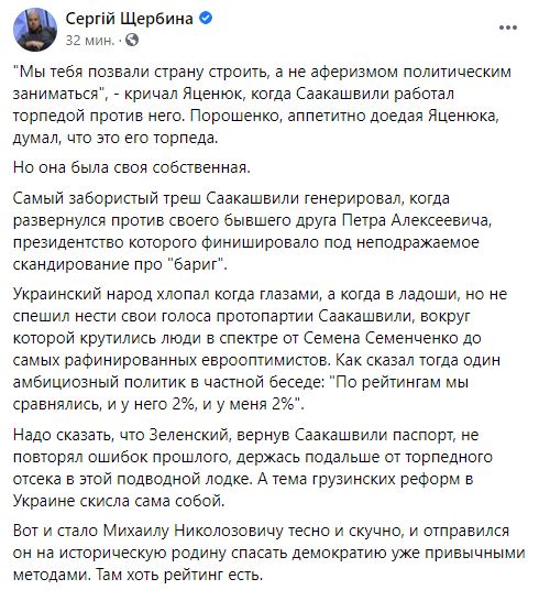 Вот и стало Михаилу Николозовичу тесно и скучно, и отправился он на историческую родину спасать демократию уже привычными методами. Там хоть рейтинг есть" - написал журналист Сергей Щербина.
