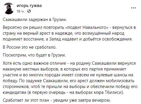 "Саакашвили задержан в Грузии. Вероятно он решил повторить "подвиг Навального" - вернуться в страну на верный арест в надежде, что возмущённый народ поднимет восстание, а Запад надавит и добьётся освобождения.