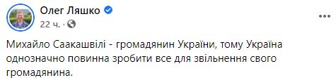 "Михаил Саакашвили - гражданин Украины, поэтому Украина однозначно должна сделать все для освобождения своего гражданина" - написал лидер радикальной партии Олег Ляшко.