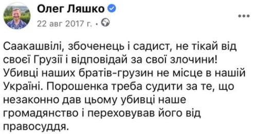 При этом в сети напомнили пост Ляшко, сделанный несколько лет назад, в котором он назвал получившего украинское гражданство Саакашвили извращенцем и посоветовал ему не бежать от Грузии и ответить там за свои преступления.