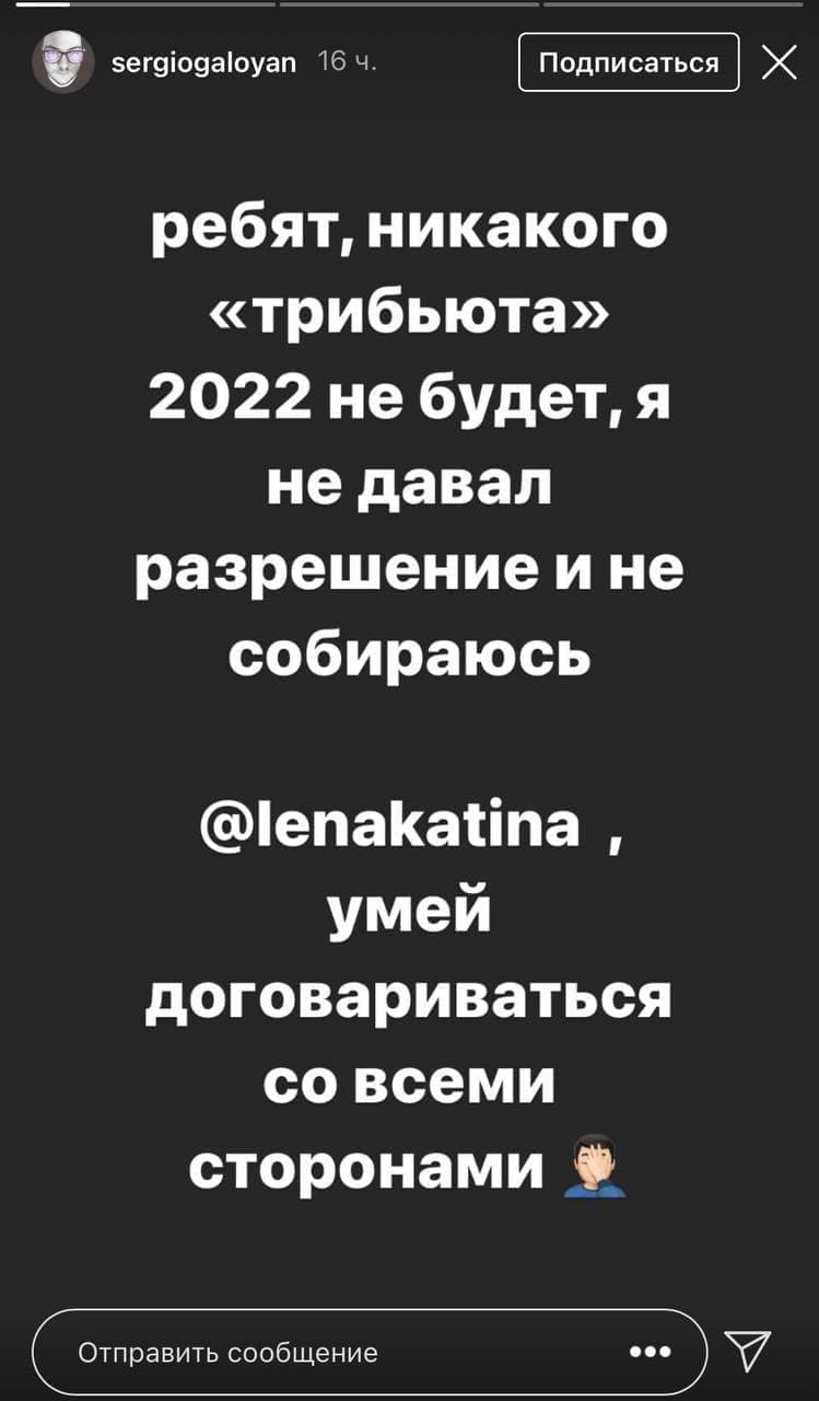 "Ребят, никакого "трибьюта" 2022 не будет, я не давал разрешения и не собираюсь @ленакатина умей договариваться со всеми сторонами", - написал он у себя в сторис.