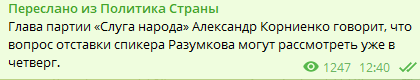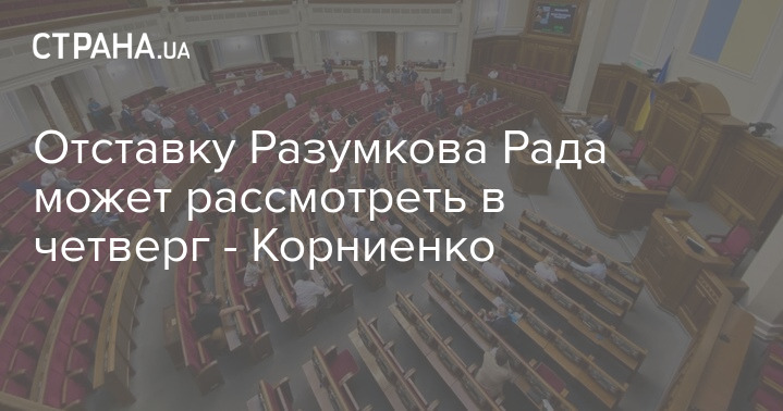 Глава партии "Слуга народа" Александр Корниенко говорит, что вопрос отставки спикера Разумкова могут рассмотреть уже в четверг, 7 октября, накануне дня рождения спикера Дмитрия Разумкова.