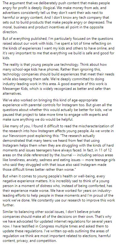 "Если бы мы хотели игнорировать исследования, зачем бы мы создали ведущую в отрасли программу исследований, чтобы разобраться в этих важных вопросах? Если бы мы не заботились о борьбе с вредным контентом, то почему мы наняли гораздо больше людей, занимающихся этим, чем любая другая компания в нашем пространстве?" - написал Цукерберг.