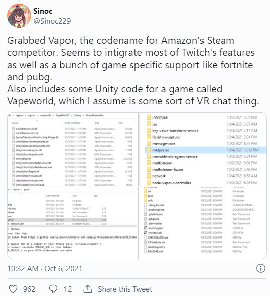 Так, пользователь с ником "Sinoc229" нашёл пласт интересной информации. Например, появились данные про Vapor — аналоге Steam (онлайн-сервис цифрового распространения компьютерных игр и программ) от Amazon Games.