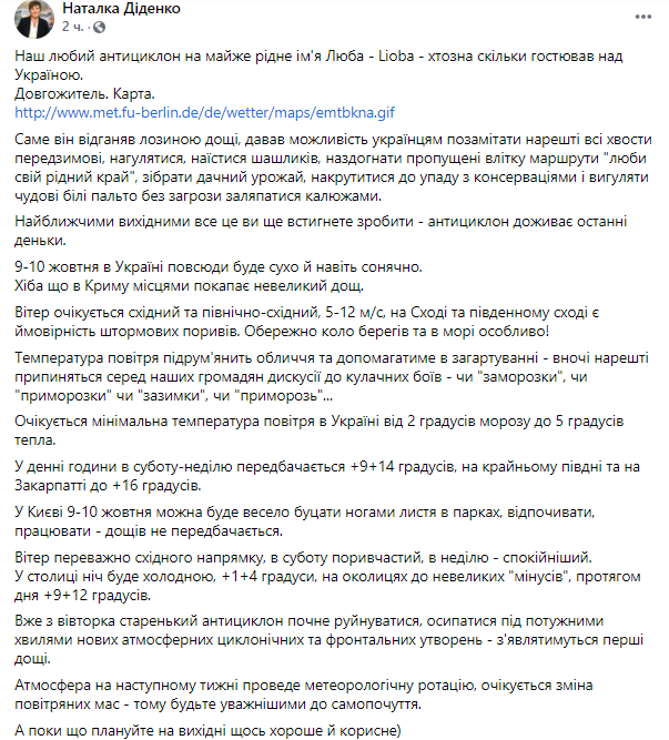 Гостивший над Украиной антициклон с почти родным для украинцев именем Lioba (Люба) отгонял прутом дожди, давал возможность украинцам нагуляться, наесться шашлыков, догнать пропущенные летом маршруты, собрать дачный урожай. Все это еще можно будет успеть сделать в наступающие выходные - антициклон доживает последние дни. Об этом предупредила синоптик Наталья Диденко.
