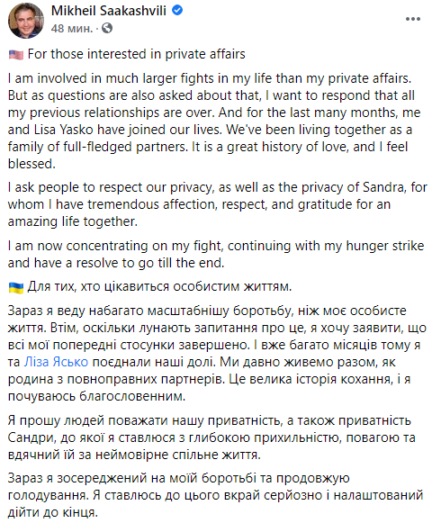 "Для тех, кто интересуется личной жизнью. Сейчас я веду гораздо более масштабную борьбу, чем моя личная жизнь. Впрочем, поскольку звучит вопрос об этом, я хочу заявить, что все мои предыдущие отношения завершены. И уже много месяцев назад я и Лиза Ясько объединили наши судьбы. Мы давно живем вместе, как семья из полноправных партнеров. Это большая история любви, и я чувствую себя благословенным", - написал Саакашвили.