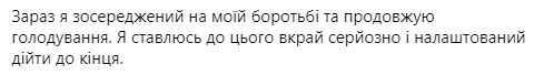 "Сейчас я сосредоточен на моей борьбе и продолжаю голодовать. я отношусь к этому очень серьезно и настроен дойти до конца", - написал он.