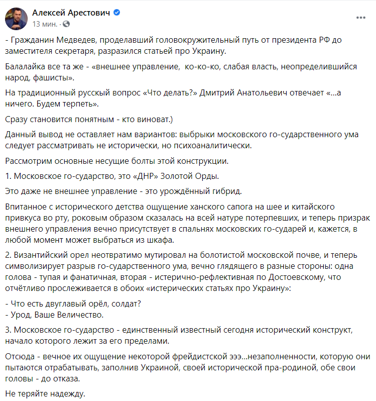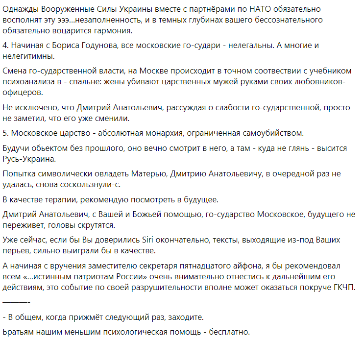 Он написал пост в еще более резких, чем Медведев, тонах, вывалив целый ворох историко-психологических претензий к России - от "гибридного" Московского царства до "мутировавшего" двуглавого орла.