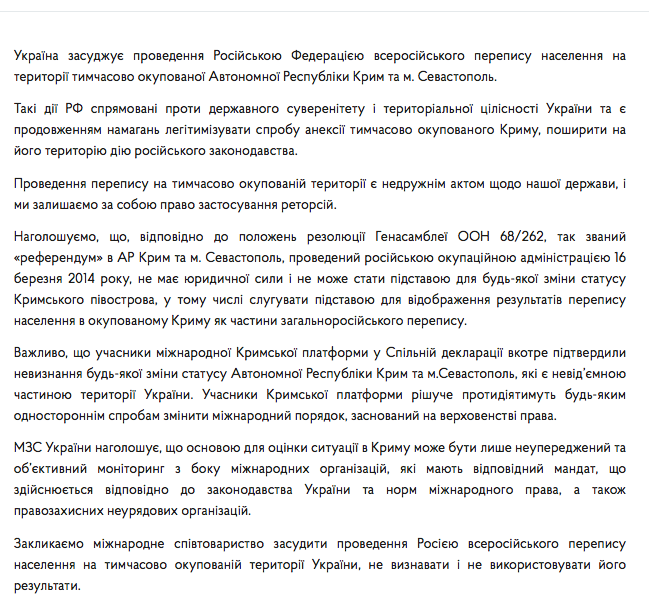 С утра заявление опубликовал МИД Украины. Ведомство осудило начало российской переписи населения на территории Крыма. Ее Киев назвал недружественным актом по отношению к Украине, оставляющим за ней право применения реторсий (принудительных действий). "Такие действия РФ направлены против государственного суверенитета и территориальной целостности Украины", — заявили в МИД.