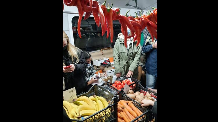 В вагоне метро Киева устроили одновременно овощной базар, салон красоты и концерт. Фото