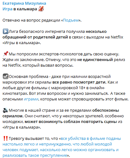 "Лига безопасного интернета" получила несколько обращений от родителей в связи с выходом на Netflix "Игры в кальмара". Многие в нашей стране и за ее пределами обеспокоены сериалом. Они считают, что у некоторых зрителей, особенно у молодежи, может возникнуть соблазн повторить сцены из "Игры в кальмара", - написала директор организации Екатерина Мизулина в своем Telegram-канале.