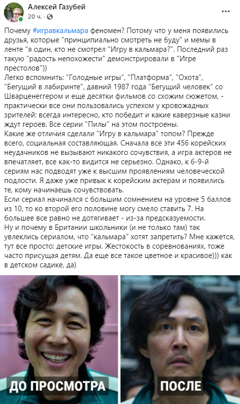 Основатель сервиса Opendatabot Андрей Хорсев пишет, что реакция публики на сериал "Игра в кальмара" говорит об отупении общества.