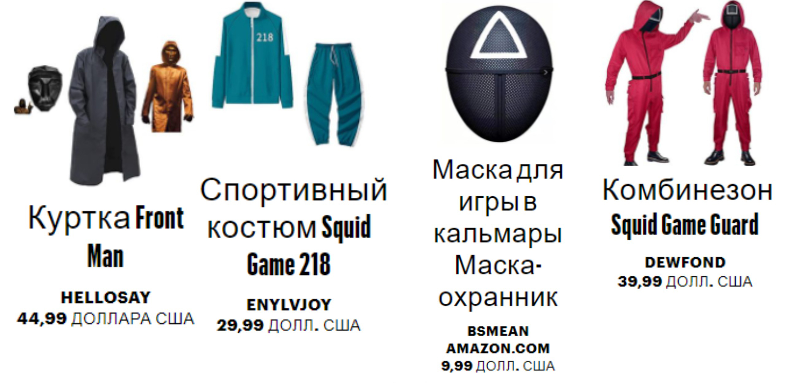 Еще один показатель популярности - то, что в южнокорейских интернет-магазинах уже раскупают одежду и обувь, в которую одеты игроки, а некоторые бренды изготавливают игровые костюмы охранников и участников по мере приближения Хэллоуина. То есть создатели костюмов будут извлекать наибольшую маркетинговую выгоду из культовых образов шоу.
