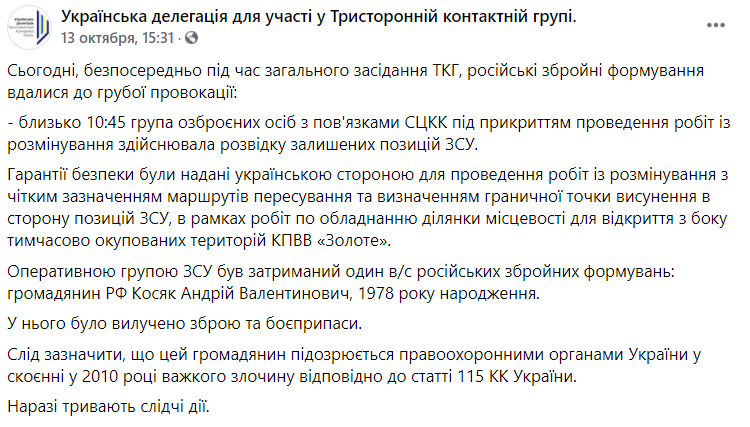 13 октября Украина задержала в Луганской области уроженца Алчевска Андрея Косяка, члена Совместного центра по контролю и координации от "ЛНР".