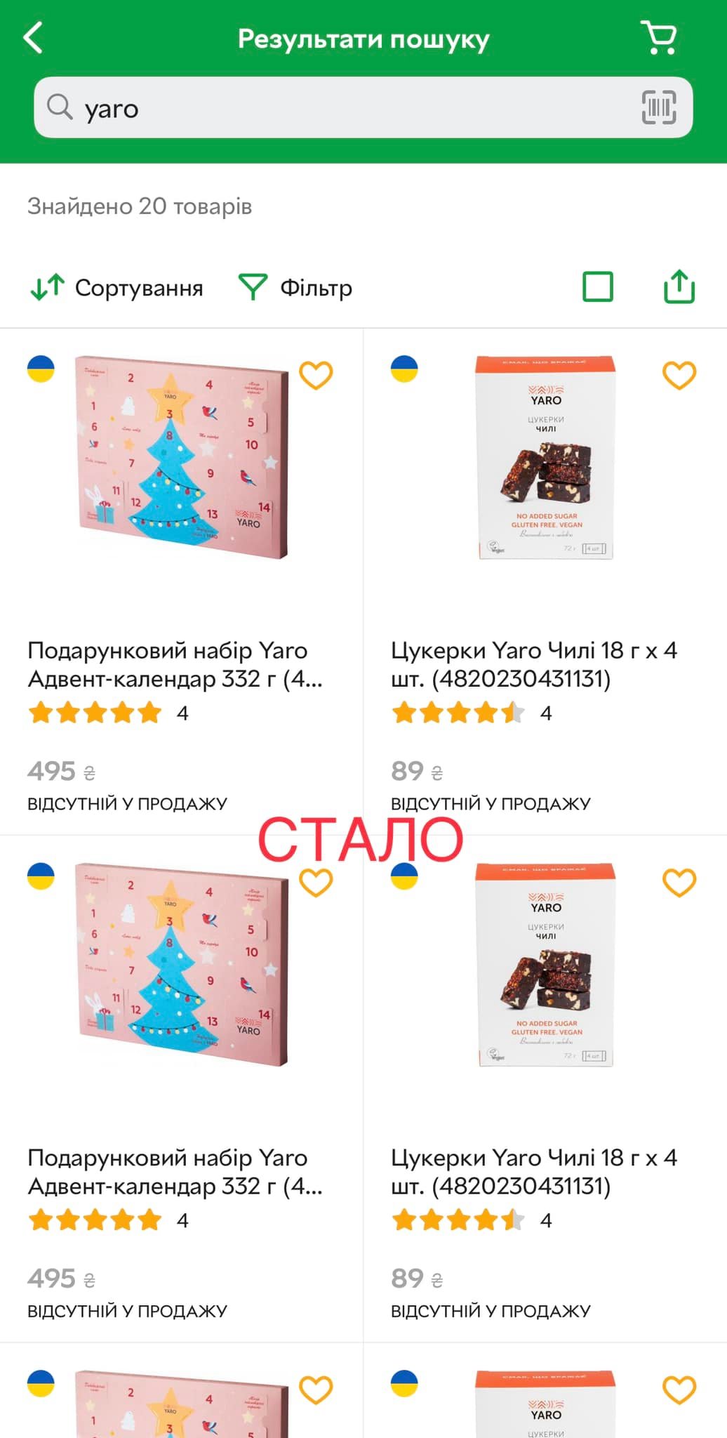 Во вторник, 19 октября, Стерненко написал, что товары Yaro из продажи убрали и другие торговые площадки - Сильпо перестали доставлять в Киеве, исчезла продукция на сайте в Winestore, в "Алло" пишут, что товаров нет в наличии, сеть кофеен "Идеалист" заявила, что прекращает продажу, в Rocket и Glovo также исчезли товары и доставка из заведений Yaro.