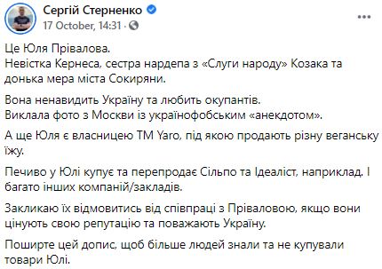 "Это Юля Привалова. Невестка Кернеса, сестра нардепа из "Слуги народа" Козака и дочь мэра города Сокиряны. Она ненавидит Украину и любит оккупантов. Выложила фото из Москвы с украинофобским "анекдотом" - написал Стерненко и призвал сеть супермаркетов "Сильпо" и кофейни "Идеалист" отказаться от сотрудничества с Приваловой, "если они дорожат своей репутацией и уважают Украину".