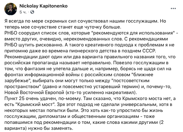 РНБО соорудил список слов, которые "рекомендуются для использования" - вместо других, очевидно, нерекомендованных слов. С рекомендациями РНБО шутить рискованно. А такого креативного подхода к проблемам я не припомню даже во времена пионерского детства в позднем СССР.