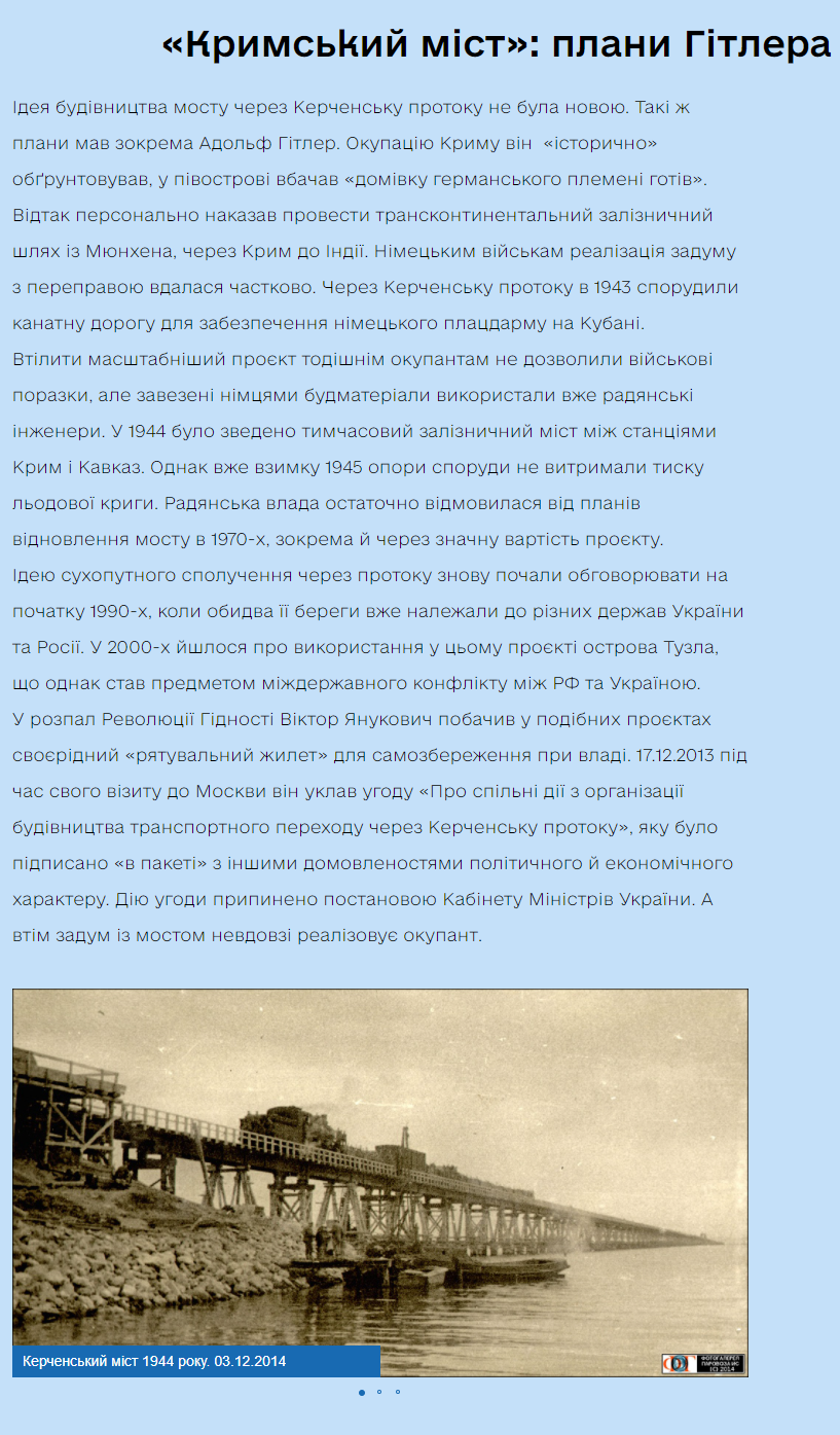 В разгар революции Достоинства Виктор Янукович увидел в подобных проектах своеобразный "спасательный жилет" для самосохранения у власти. 17.12.2013 во время своего визита в Москву он заключил соглашение "О совместных действиях по организации строительства транспортного перехода через Керченский пролив", которое было подписано "в пакете" с другими договоренностями политического и экономического характера. Действие соглашения прекращено постановлением Кабинета Министров Украины. Впрочем замысел с мостом вскоре реализует оккупант", - говорится на сайте.