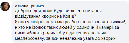 "Когда будет решен вопрос посещения больных ковидом? Если в больнице нет места или состояние не слишком тяжелое, никто не изолирует людей в одиночной камере, за ними заботятся родственники. А в отделениях нехватка медперсонала, отсюда недостаточное внимание к больным", - пишет Алена в фейсбуке.