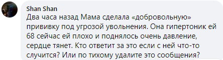 Жалуются горожане и на принудительную вакцинацию: "Два часа назад Мама сделала "добровольную" прививку под угрозой увольнения. Она гипертоник ей 68 сейчас ей плохо и поднялось очень давление, сердце тянет. Кто ответит за это если с ней что-то случится? Или по тихому удалите это сообщение?"