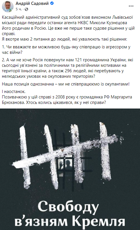 В пятницу, 22 октября, он собрал заседание Исполнительного комитета Львовского горсовета, который "единогласно отклонил требование Верховного суда о передаче останков агента НКВД Николая Кузнецова". Об этом говорится на сайте львовского горсовета.