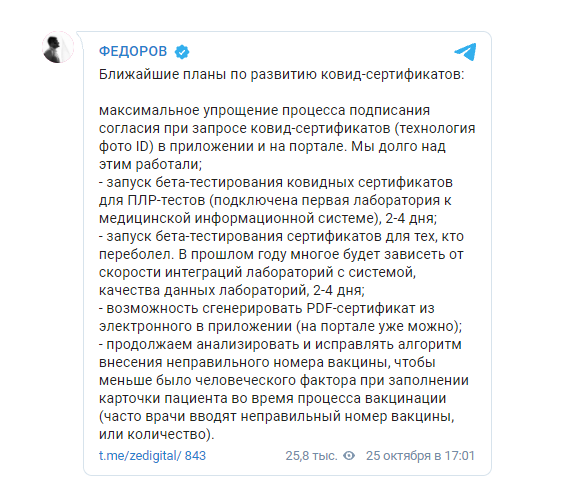 А запуск бета-тестирования сертификатов для тех, кто переболел COVID-19 будет зависеть от того, как быстро произойдет интеграция лабораторий с системой и качеством данных лабораторий.