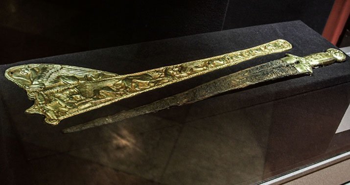 Меч с золотой рукояткой в золотых ножнах. Он был найден в 1971 году в Крыму, в кургане "Толстая Могила" возле Орджоникидзе. На рукоятке и ножнах выгравированы рисунки со сценами схватки животных.