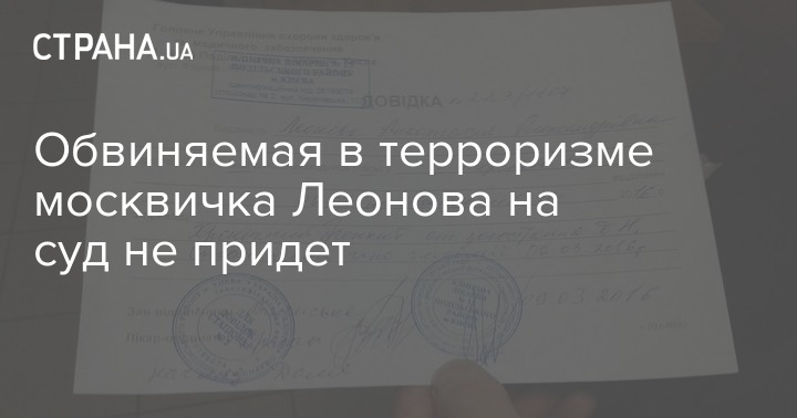 Гражданка РФ Анастасия Леонова, которую обвиняют в Украине в терроризме, не придет сегодня на суд из-за плохого самочувствия. Об этом из зала суда сообщает корреспондент Страны. Подозреваемая в телефонном режиме сообщила адвокату, что очень плохо себя чувствует и останется в больнице до воскресенья. В справке о болезни Анастасии Леоновой сказано, что у девушки острый бронхит. Судебное заседание по делу Леоновой состоится сегодня в 11:30, однако, его могут перенести из-за неявки Леоновой.