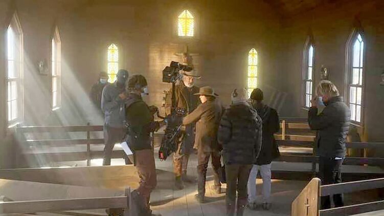 На опубликованном фото Алек Болдуин - в центре кадра. А застреленная им через несколько минут оператор Галина Хатчинс - в куртке и шапке спиной на первом плане.