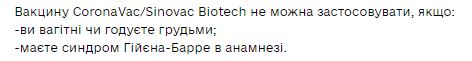 На официальном ресурсе Минздрава о вакцинации vaccination.covid19.gov.ua сообщают, что  беременным и кормящим грудью нельзя применять CoronaVac/Sinovac Biotech.