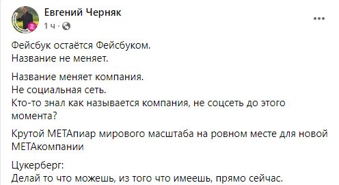 "Фейсбук остаётся Фейсбуком. Название не меняет. Название меняет компания. Не социальная сеть. Кто-то знал как называется компания, не соцсеть до этого момента? Крутой МЕТАпиар мирового масштаба на ровном месте для новой МЕТАкомпании. Цукерберг: Делай то что можешь, из того что имеешь, прямо сейчас" - написал бизнесмен Евгений Черняк.