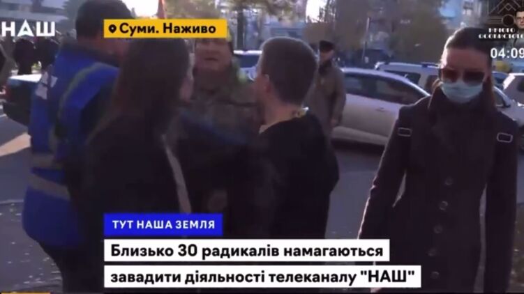 В Суммах радикалы напали на съемочную группу канала "Наш". Фото: Скриншот из видео