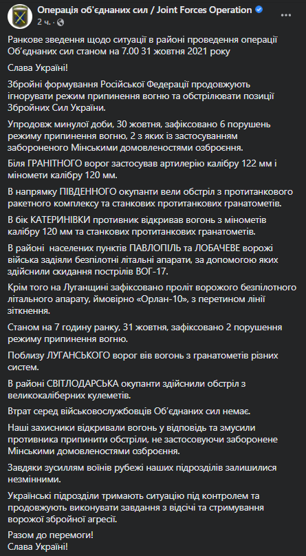 "В районе населенных пунктов Павлополь и Лобачево вражеские войска применили беспилотные летательные аппараты, при помощи которых совершили сброс выстрелов ВОГ-17", - говорится в сообщении штаба ООС.