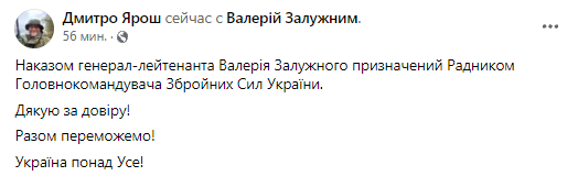 "Приказом генерал-лейтенанта Валерия Залужного назначен Советником Главнокомандующего Вооруженными Силами Украины. Спасибо за доверие! Вместе победим! Украина прежде всего!" - написал Ярош в Facebook