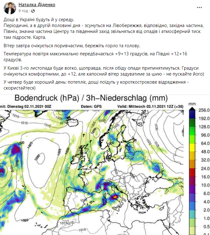 Об этом пишет в Фейсбук синоптик Наталья Диденко.