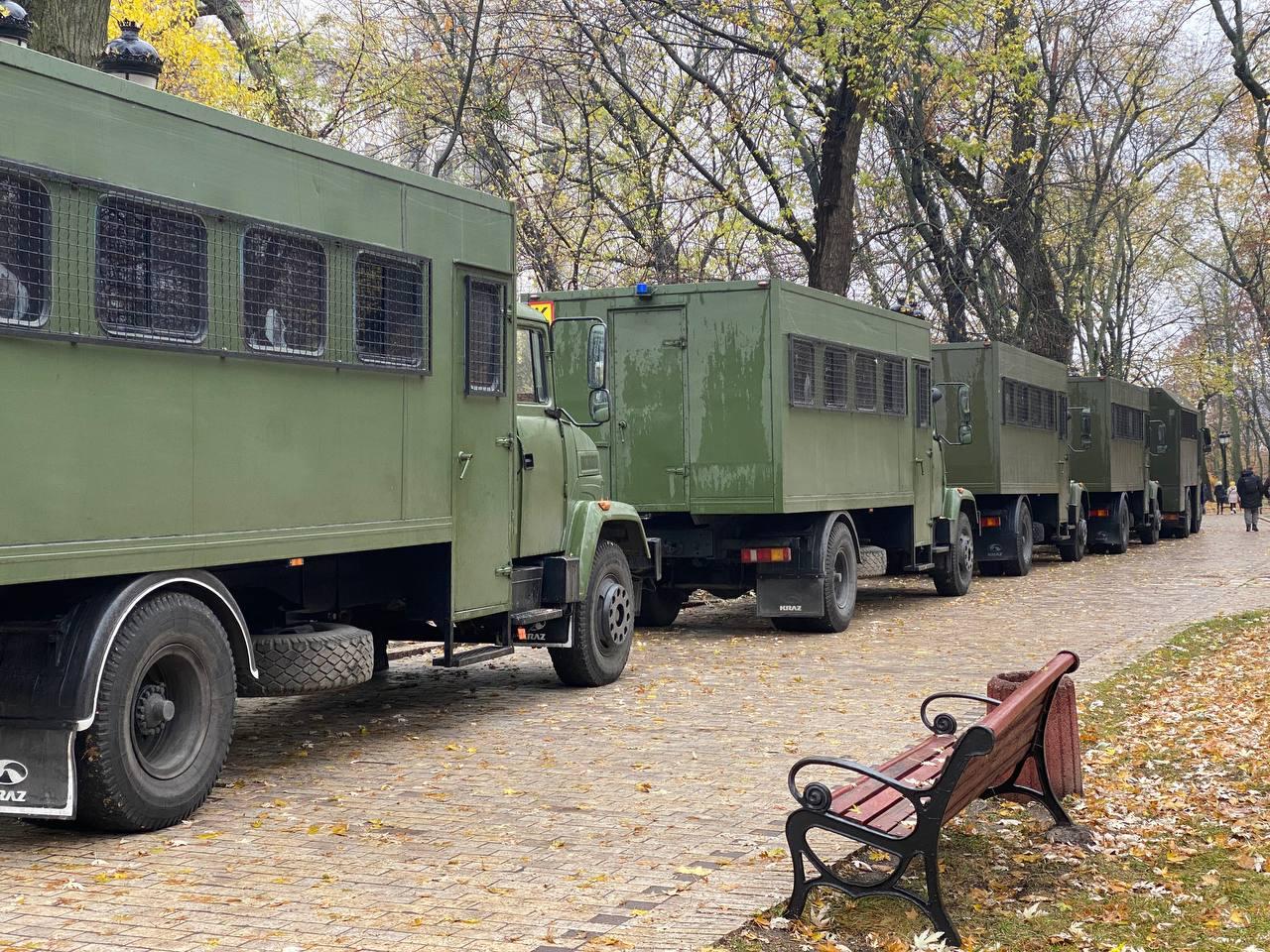 В Мариинском парке во время акции было припарковано несколько десятков автозаков правоохранителей. Но они никак не реагировали на блокировку дорог протестующими.
