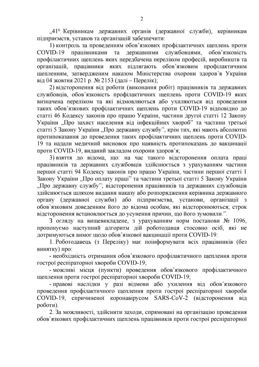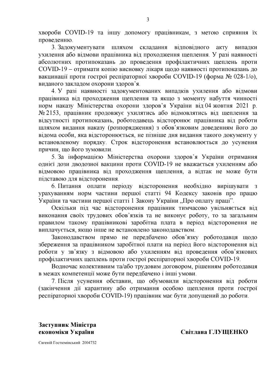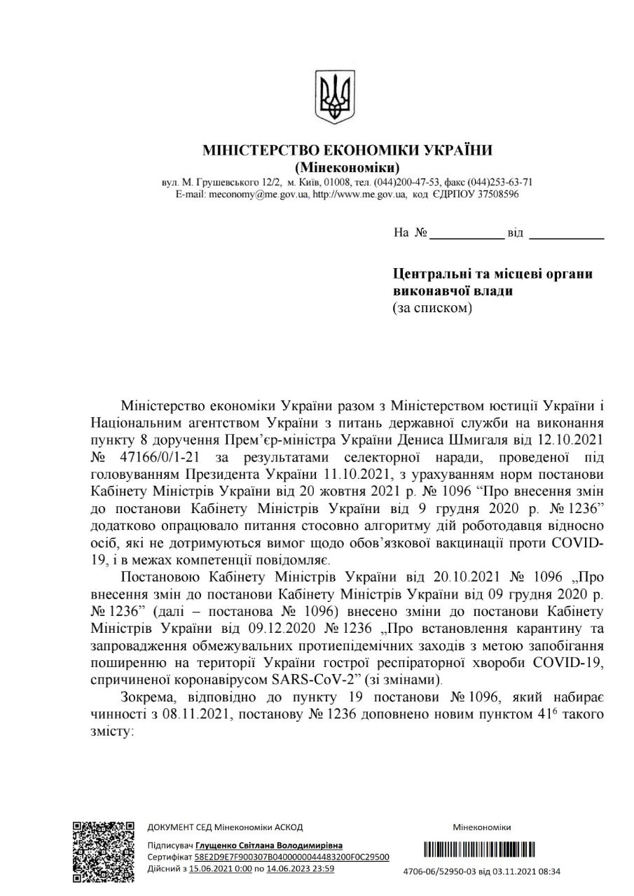 Министерство экономики Украины разослало центральным и местным органам исполнительной власти разъяснение по поводу алгоритма отстранения от работы лиц, которые не придерживаются требований относительно обязательной вакцинации против COVID-19. Письмо ведомства опубликовал адвокат, старший партнер адвокатской компании "Кравец и партнеры" Ростислав Кравец.
