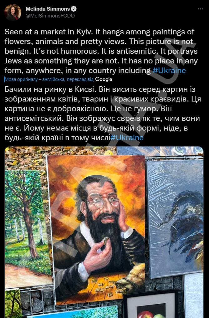 На этой неделе посол Британии в Украине Мелинда Симмонс возмутилась продажей в Киеве антисемитской картины после того, как на одном из рынков Киева она увидела картину еврея с монетой в руке.