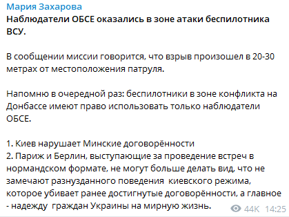В тоже время официальный представитель МИД РФ Мария Захарова обвинила в применении беспилотника Киев.