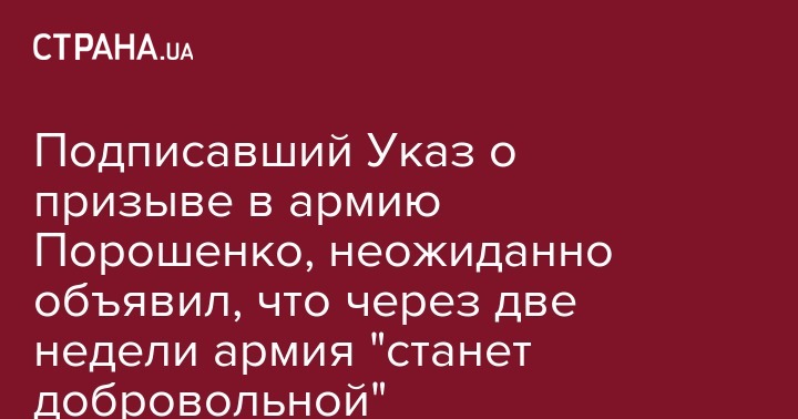 Отметим, что украинская армия не может быть контрактной и добровольческой, так как в стране существует обязательный призыв в армию (который сам же Порошенко объявил несколько недель назад). То есть, юноши идут служить по призыву, а не добровольно. Полностью добровольной армия была бы, если б отменили призыв. Скорее всего, Порошенко имел в виду, что более не будут проводиться мобилизации (а ранее мобилизованных к концу октября демобилизуют). Но об отмене призыва никто не говорит.