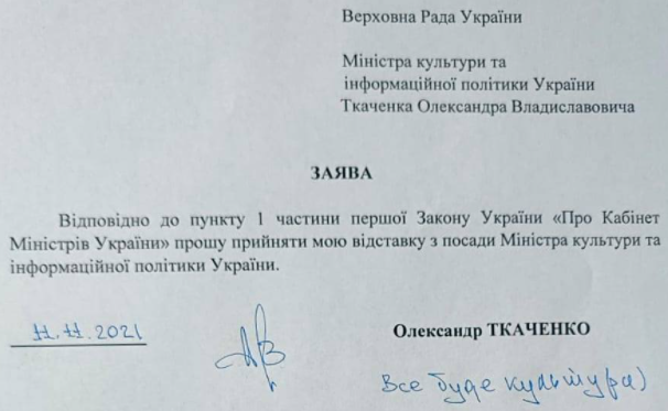 Сегодня министр культуры Александр Ткаченко подтвердил официально: он идет в отставку.