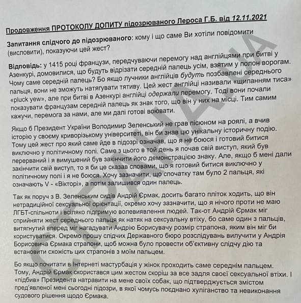 Лучники, "виктори" и сексуальная ориентация Ермака. Лерос объяснил следователям "фак" Зеленскому. Документ
