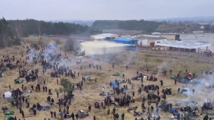 Также в сети появилось видео противостояния польских пограничников и мигрантов, снятое с дрона. На кадрах виден момент применения поляками водомета и использование светошумовых гранат.