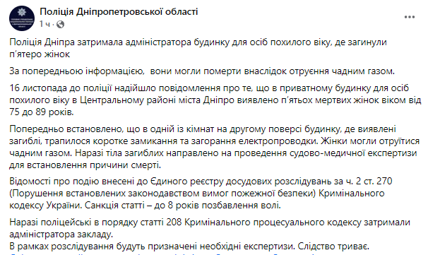 Пять пожилых женщин погибли в результате пожара, который произошел в частном доме престарелых, расположенном в центре Днепра. Трагедия случилась во вторник, 16 ноября. Правоохранителям поступило сообщение о том, что в одной из комнат заведения обнаружены мертвыми пять женщин в возрасте от 75 до 89 лет. Об этом сообщает Нацполиция Днепра.