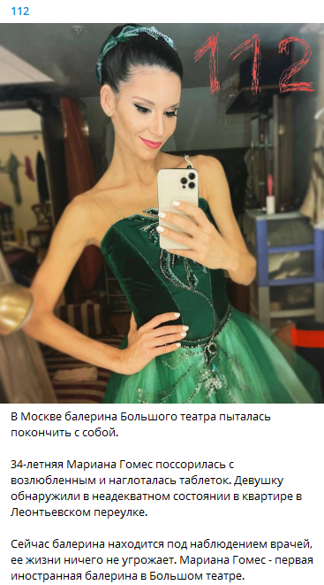 В Москве первая иностранная балерина Большого театра 34-летняя Мариана Гомес пыталась свести счеты с жизнью. Как пишут российские СМИ, она наглоталась таблеток. Однако девушку обнаружили в неадекватном состоянии в квартире в Леонтьевском переулке и передали медикам.