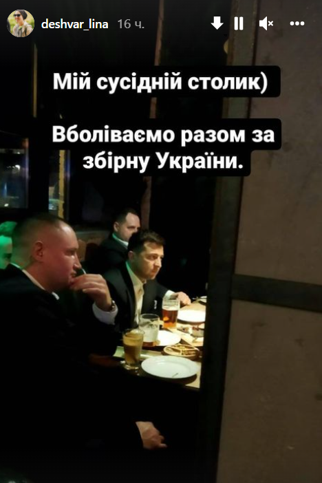 Но более интересной оказалось соседство Зеленского с киевской активисткой Линой Дешвар. Она тоже запостила сторис о том, что ее столик оказался рядом с президентским.