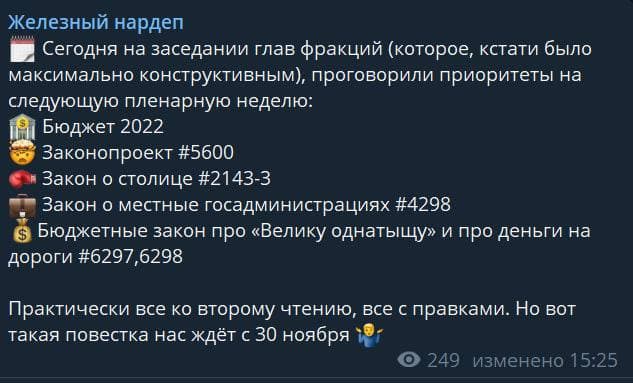 "Практически все ко второму чтению, все с правками. Но вот такая повестка нас ждет с 30 ноября", - говорится в сообщении.