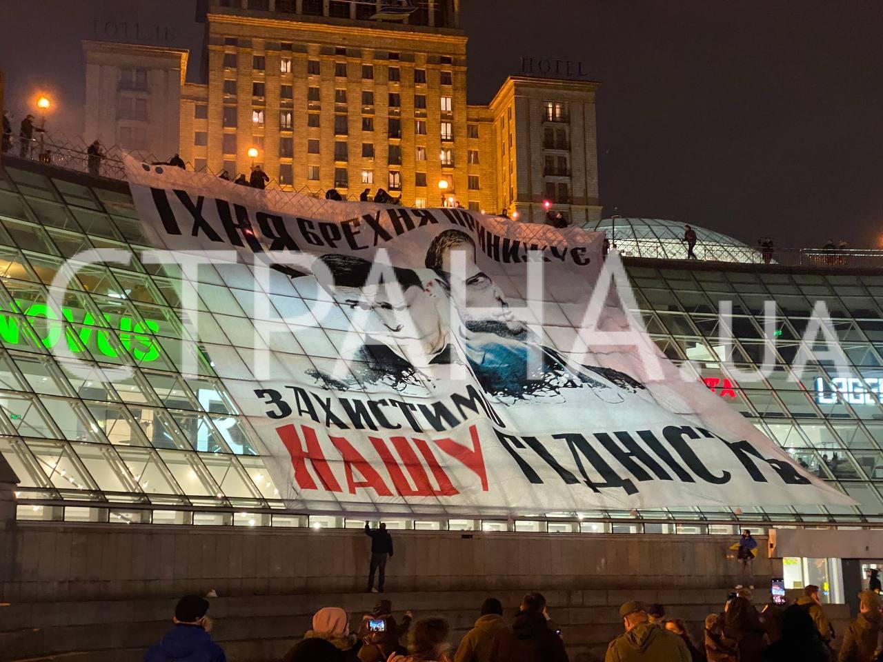 17:39 Участники марша растянули большой банер с изображением Владимира Зеленского и руководителя его офиса Андрея Ермака с надписью "Их ложь унижает. Защитим наше достоинство".