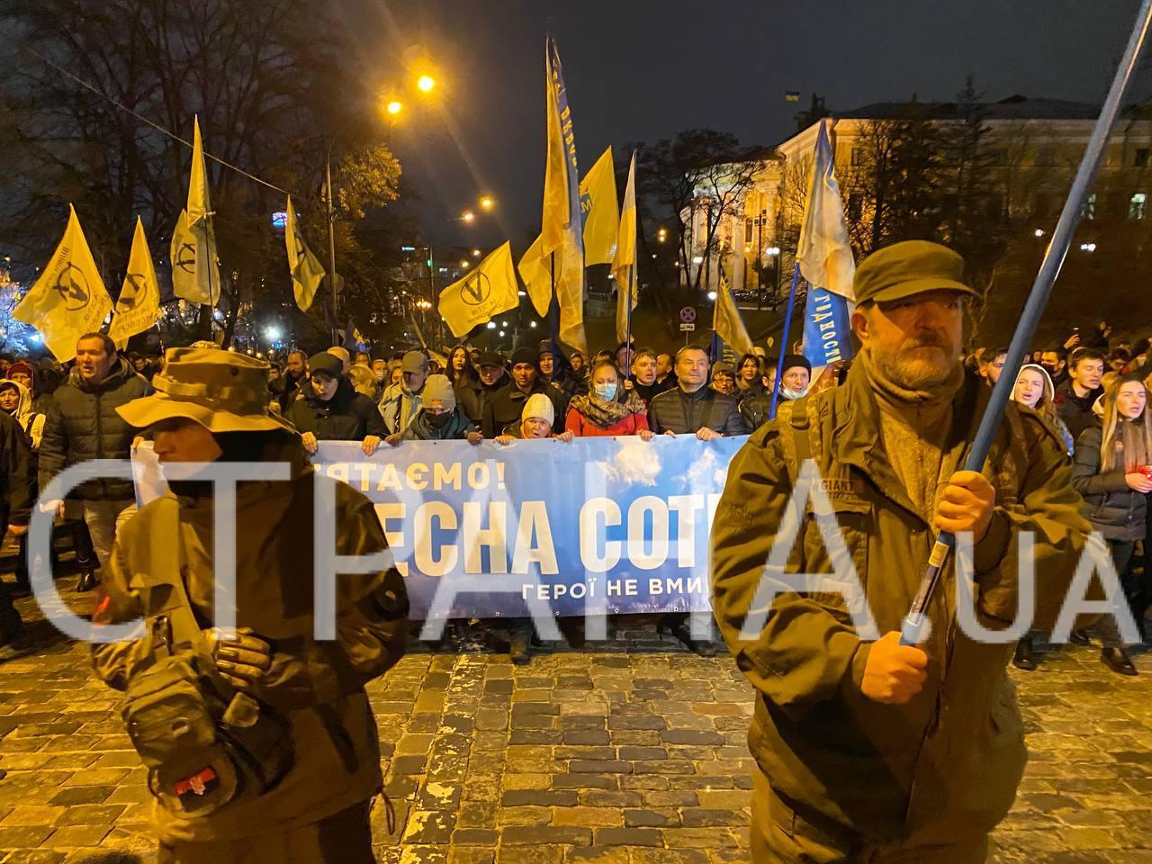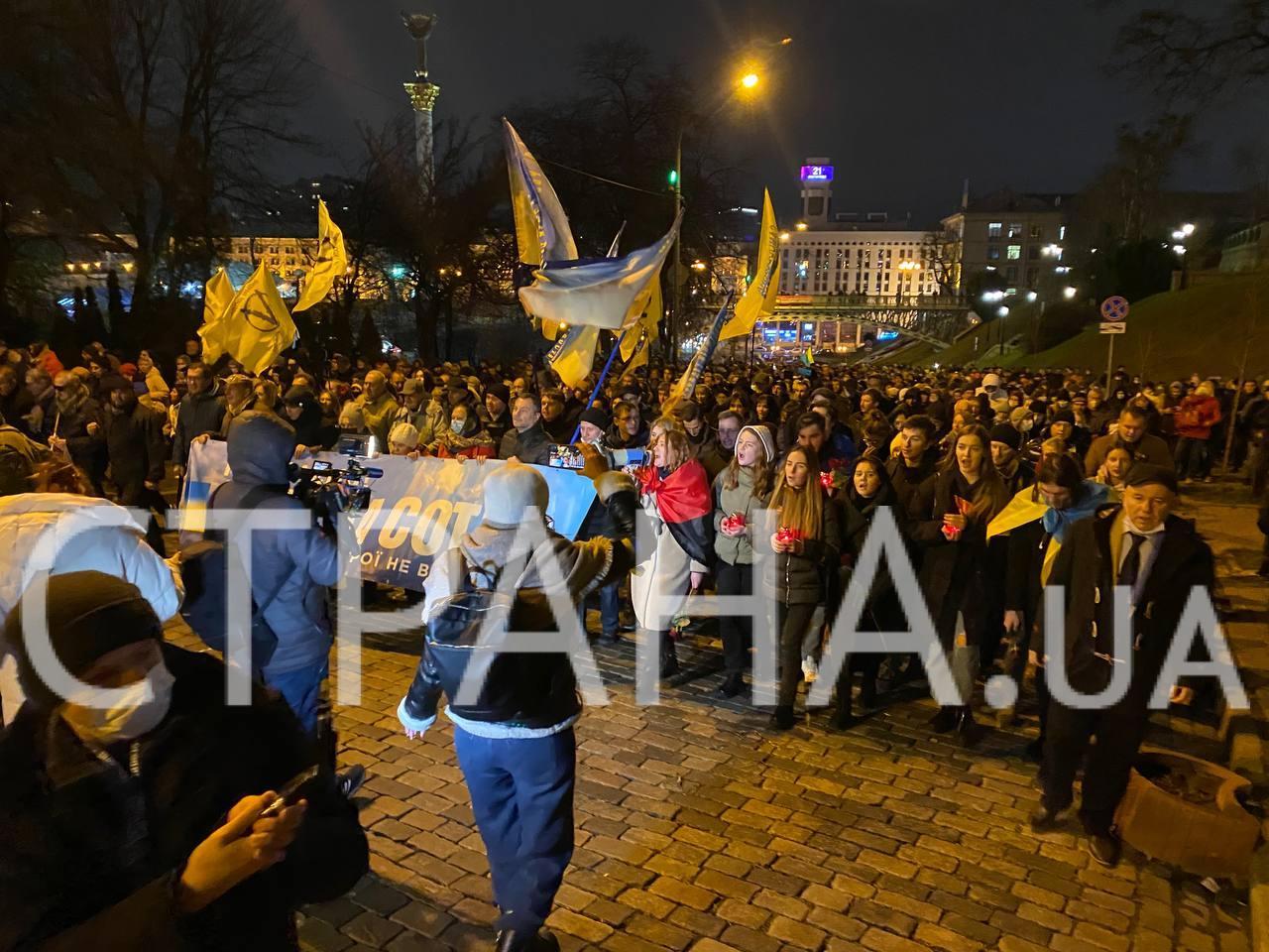 17:50 Началось шествие. Люди громко скандируют: "Україна понад усе", "Слава Україні - Героя слава", "Героям - слава, слава, слава", "Одна єдина соборна Україна".