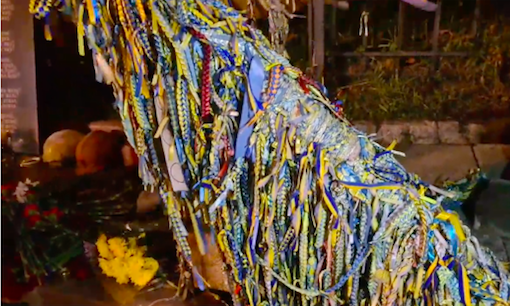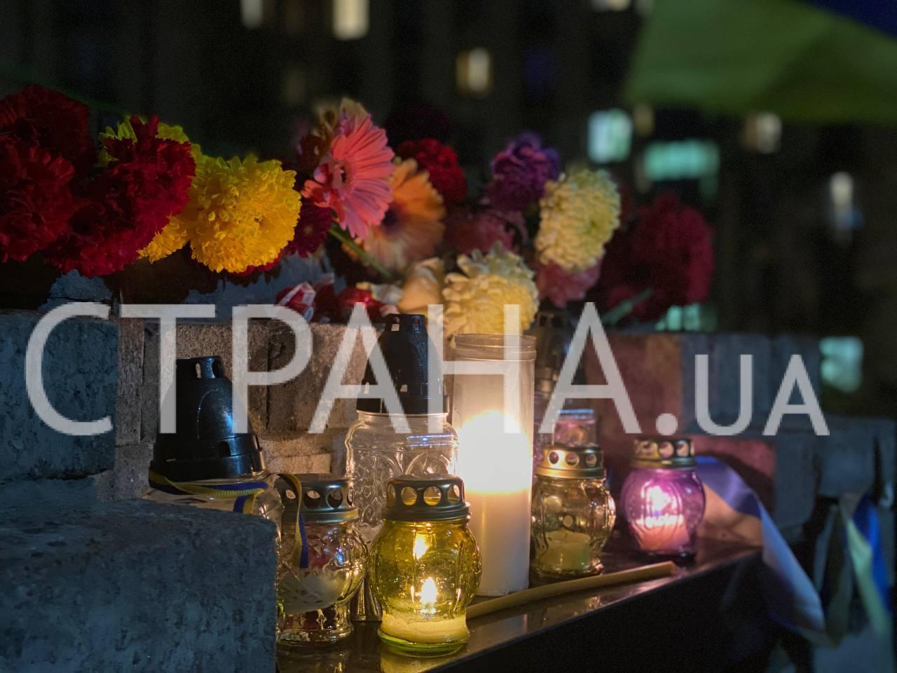 17:28 Лампадки и цветы на Институтской. Также участники ожидаемого шествия повязывают там желто-синие ленты такие, как носили участники Евромайдана восемь лет назад.